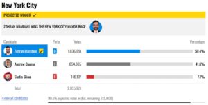 Cho đến thời điểm này, theo dự đoán của CNN thì Zohran Mamdani thuộc đảng Dân chủ bị coi là theo “xã hội chủ nghĩa dân chủ”, 34 tuổi, người tập trung vào các vấn đề của giai cấp công nhân và sức hút cá nhân, đã đưa một chiến dịch tranh cử từng bị đánh giá thấp, trở thành tâm điểm chú ý trên toàn quốc, đã giành chiến thắng trong cuộc bầu cử thị trưởng NYC.